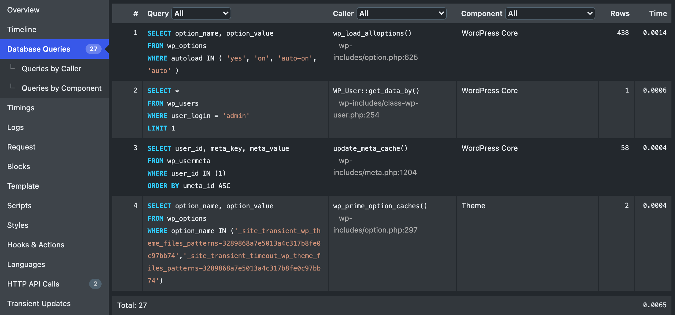 • Database queries, including notifications for slow, duplicate, or erroneous queries. Allows filtering by query type (SELECT, UPDATE, DELETE, etc), responsible component (plugin, theme, WordPress core), and calling function, and provides separate aggregate views for each.