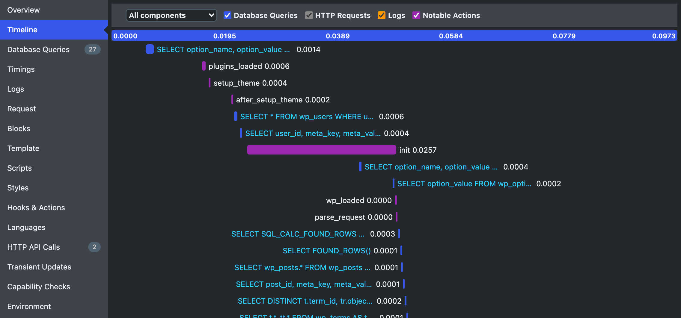 It includes some advanced features such as debugging of Ajax calls, REST API calls, user capability checks, and full support for block themes and full site editing. It includes the ability to narrow down much of its output by plugin or theme, allowing you to quickly determine poorly performing plugins, themes, or functions.