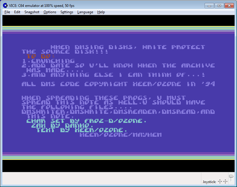 According to the attached note, I wrote it to upload C64 demos to local BBSes but it was also used by me and the few people I still swapped C64 disks with back then. Were D64 image files around in 1994? If they were I didn’t know about them. They could only be useful to users of higher capacity disks anyway. Don’t bother trying to send a message to the email address in the note. It’s an address I had in first year in college and is long gone!